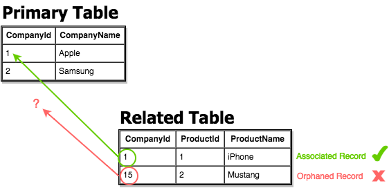 For example, if we delete row number 15 in a primary table, we need to be sure that there’s no foreign key in any related table with the value of 15. We should only be able to delete a primary key if there are no associated rows. Otherwise, we would end up with an orphaned record.